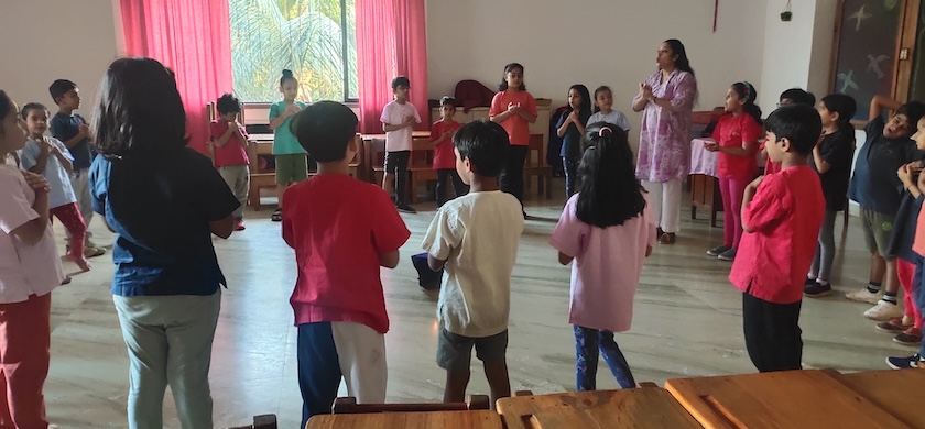 In kindergarten, circle time feels like an imaginary journey knit with a repetitive story, the festivals that came around the year; at times expressing the season, on others, painting a picture of a works man. As the children progress to grades there is a degree of challenge and age-appropriate material is included.