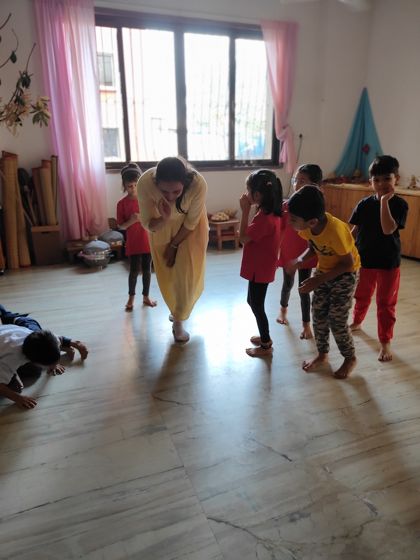 My firsthand experience with circle time was a virtual one, as the kindergarten was adapted online, due to lockdown. It was hard to gather the children and help them relate to the essence of the circle. I would gather them by singing, who will come into our wee ring and make it a little bit bigger. I personally took the names of every child, so they felt a part of the circle. It was different, a little impersonal. But when school re-opened, it was a different story altogether. I still remember when I first did the three little pigs circle with my children. It gave me goosebumps as their tiny feet and hands moved with me. We stomped, marched, huffed and puffed all in unison. I saw some engaged, some in awe, heard them hum the melody and remember every word of it very soon.  It really warmed my heart as it felt so alive! Circle time was always fulfilling, for they would attempt to mimic/imitate every gesture and sing the same way I did. One look into their eyes and it felt like they were totally immersed, imagining that they were tip-toeing in water, crossing a bridge or plucking mangoes. It always happened to end with a moment of stillness which brought a rare pause to the rhythm of our day..
