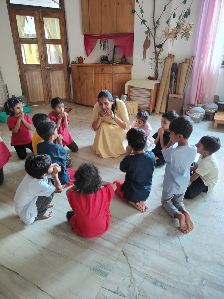 Making of a circle - Teachers would first lay a broad outline of what they want to bring to the children. Later it was fine tuned with details and a sequential flow. As children learn through imitation, we as teachers would grow organically into every circle and be thorough with every gesture and word. A lot of thought went into the gesture that would be apt with the verse, at times adding our own individuality to it.